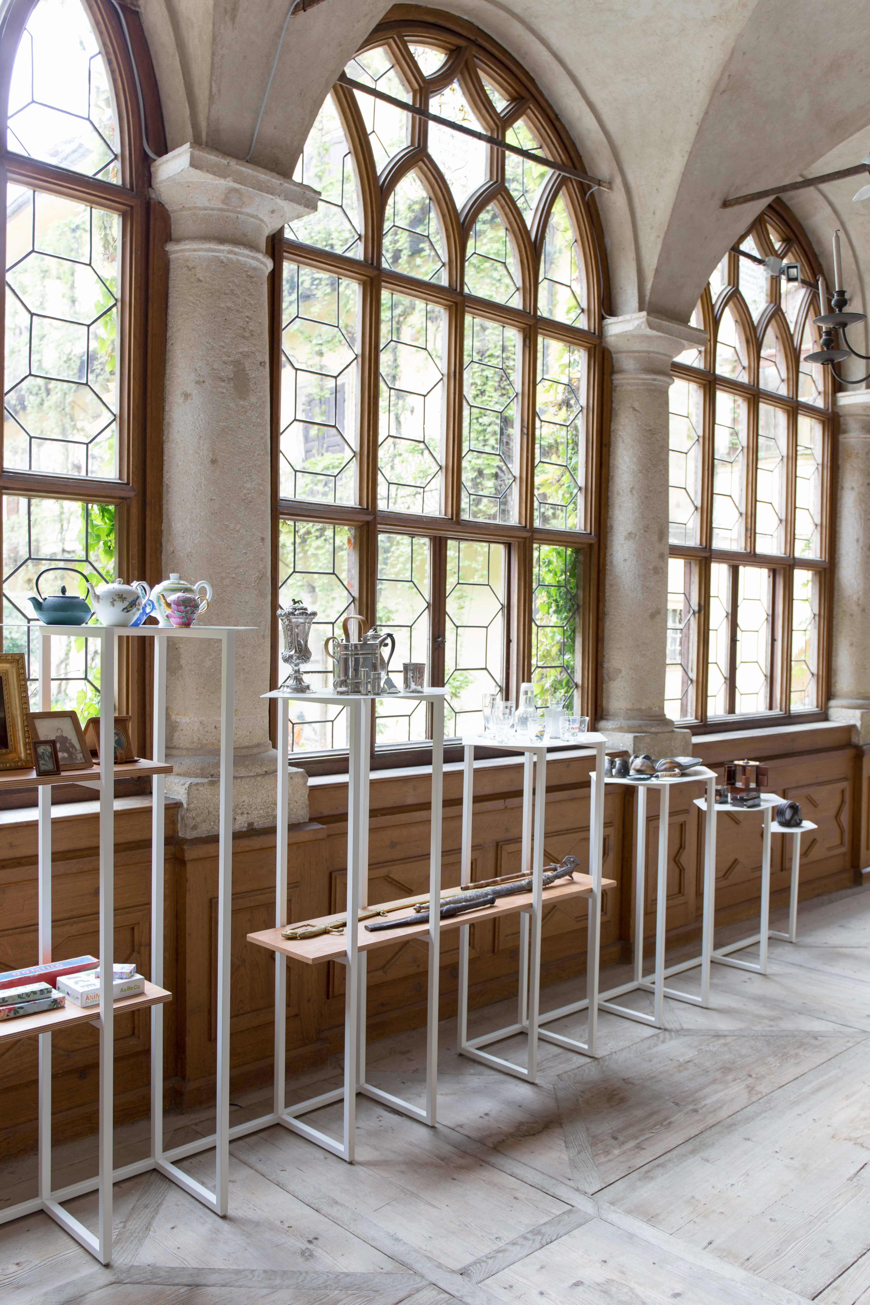 The past is for preserving, the present for living and the future for endowing. The Archive and the Rumpelkammer is an interior installation for showcasing the vast and varied treasures of Schloss Hollenegg. It is born of the desire to visualise the complex and layered history of the castle and its inhabitants. It offers two ways of presenting content, in an attempt to portray an abstract time line through tangible objects. The Archive is an organised and chronological area for displaying things, that has a clear time hierarchy and defined sections to present objects as historical artefacts. The Rumpelkammer is a continuum of the Archive that is eclectic, chaotic and fluid. Here old and new things come together in juxtaposed settings, where the objects come into their own in a more usable way. Altogether a more liveable space, to relax and read a book in, surrounded by a family of things, old and new.