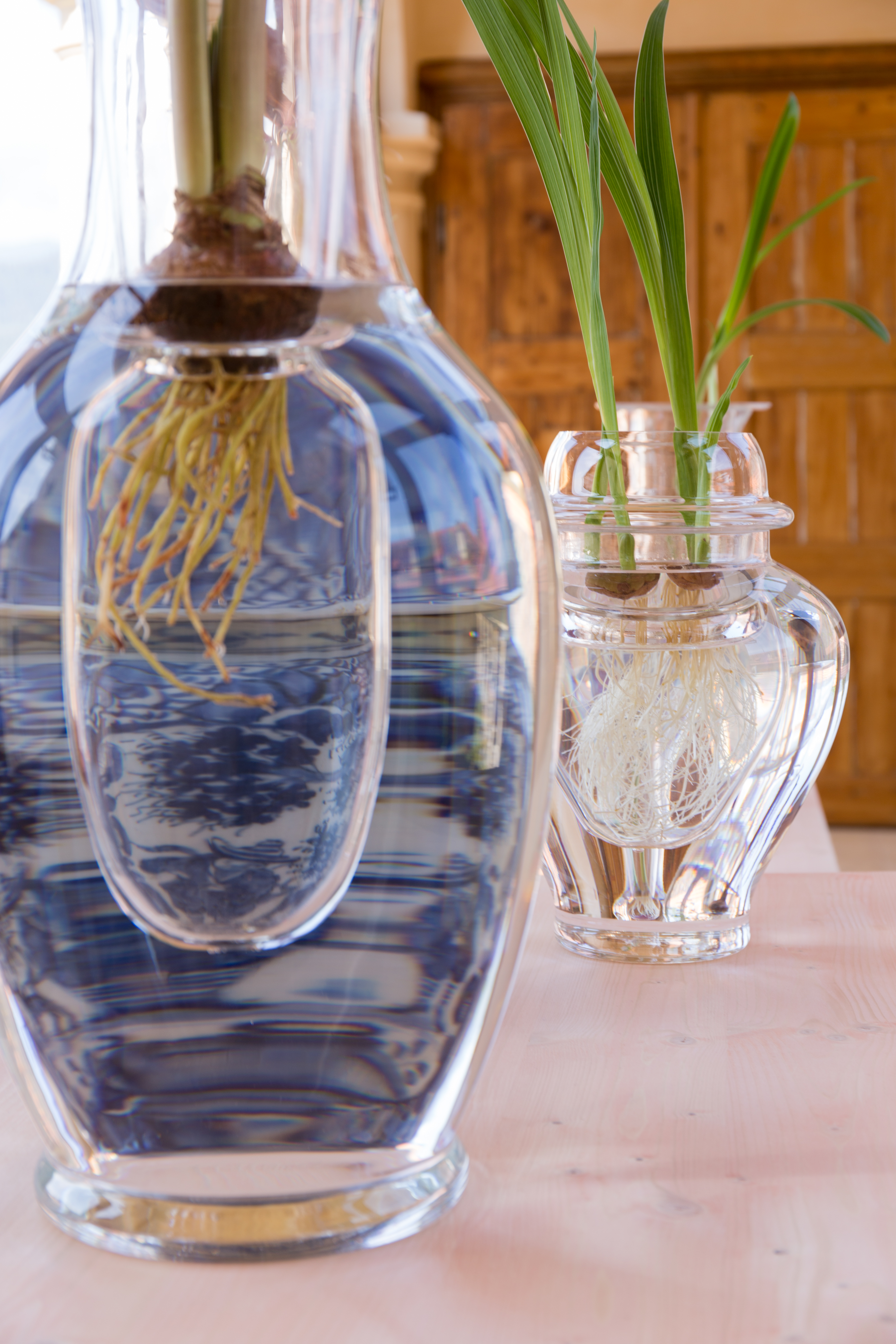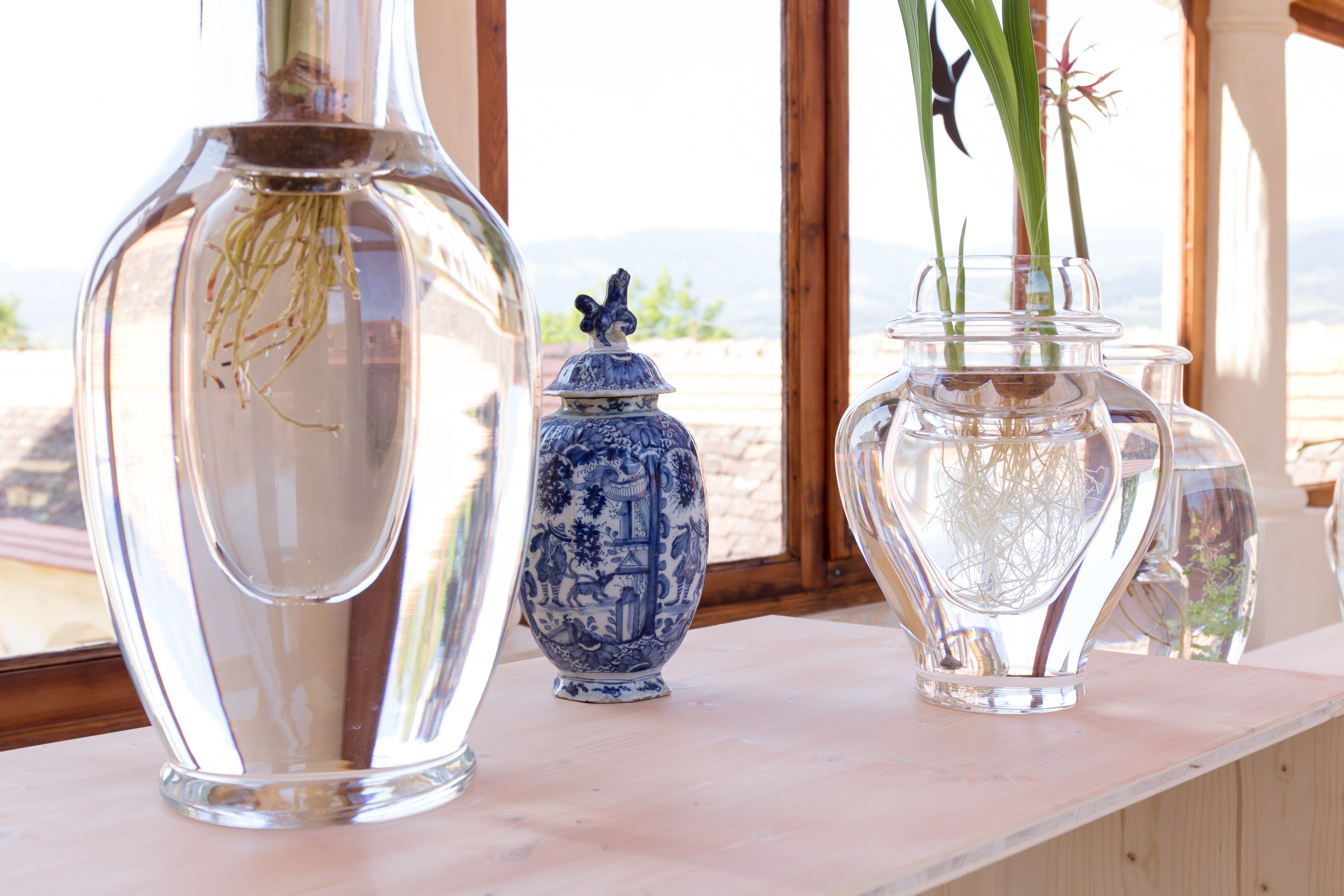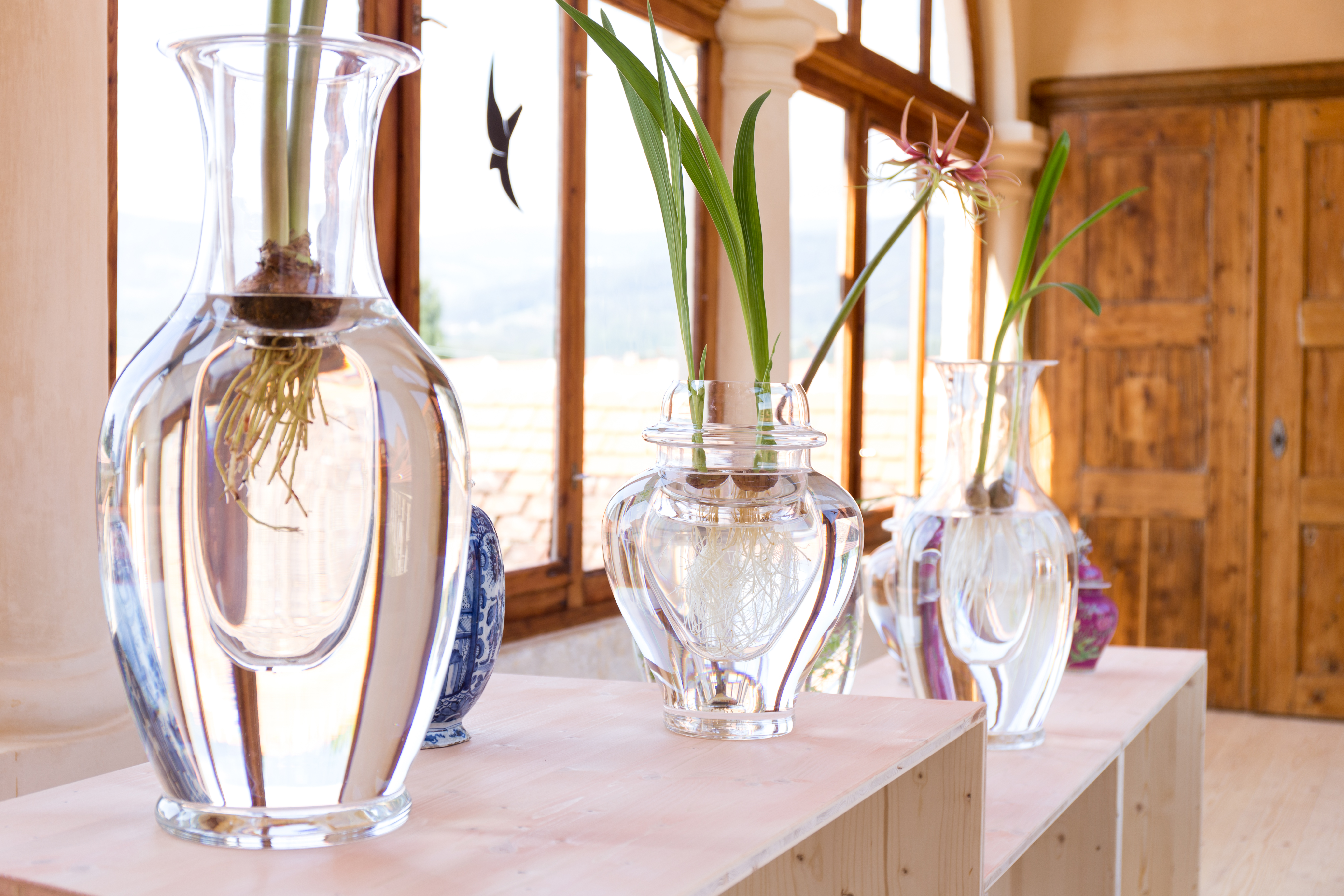 The inspiration for the project has been the figure of Princess Ludmilla (1908-1974), remembered as a passionate gardener and a proverbial green thumb. She was keen on cultivating flowers to cut and arrange in the many vases of Schloss Hollenegg. Ludmilla’s vases are born from the desire to bring back the scent and colourful presence of a continuous succession of flowers. The shape of the glass vases recalls the antique ceramic vases in the Castle, but instead of cut flowers, they will host a variety of bulbous plants. This shift from cut flowers to bulbs allows to witness, not only the last two steps of a flower’s life (blooming and decay), but to slowly observe and enjoy the whole life cycle of a flower plant: from sprouting, to decaying. The overlapping of an outer and inner vase creates two separate water compartments. Using the natural magnifying properties of water, the outer vase, with its rounded walls, becomes a magnifying vessel creating a strong focal point to observe the development of the bulb. Playing with the shape of the inner vase, various visual effects can be obtained.