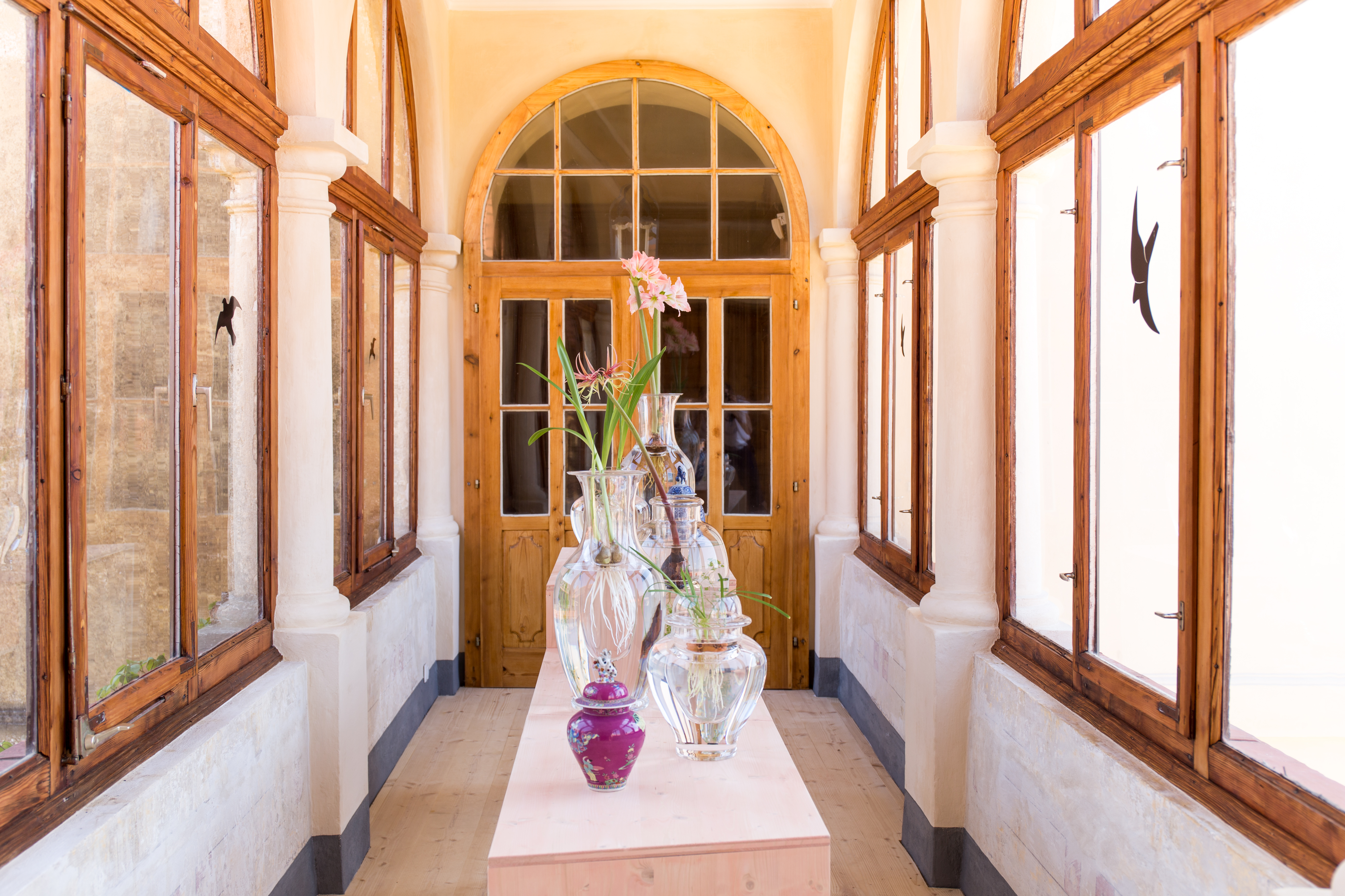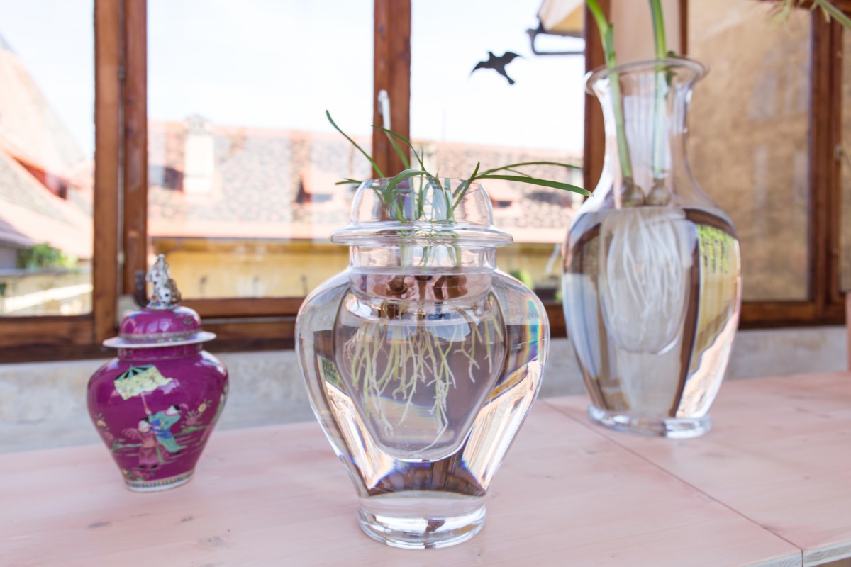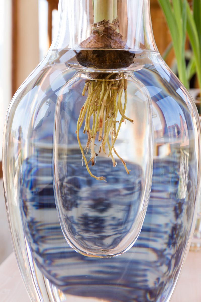 The inspiration for the project has been the figure of Princess Ludmilla (1908-1974), remembered as a passionate gardener and a proverbial green thumb. She was keen on cultivating flowers to cut and arrange in the many vases of Schloss Hollenegg. Ludmilla’s vases are born from the desire to bring back the scent and colourful presence of a continuous succession of flowers. The shape of the glass vases recalls the antique ceramic vases in the Castle, but instead of cut flowers, they will host a variety of bulbous plants. This shift from cut flowers to bulbs allows to witness, not only the last two steps of a flower’s life (blooming and decay), but to slowly observe and enjoy the whole life cycle of a flower plant: from sprouting, to decaying. The overlapping of an outer and inner vase creates two separate water compartments. Using the natural magnifying properties of water, the outer vase, with its rounded walls, becomes a magnifying vessel creating a strong focal point to observe the development of the bulb. Playing with the shape of the inner vase, various visual effects can be obtained.