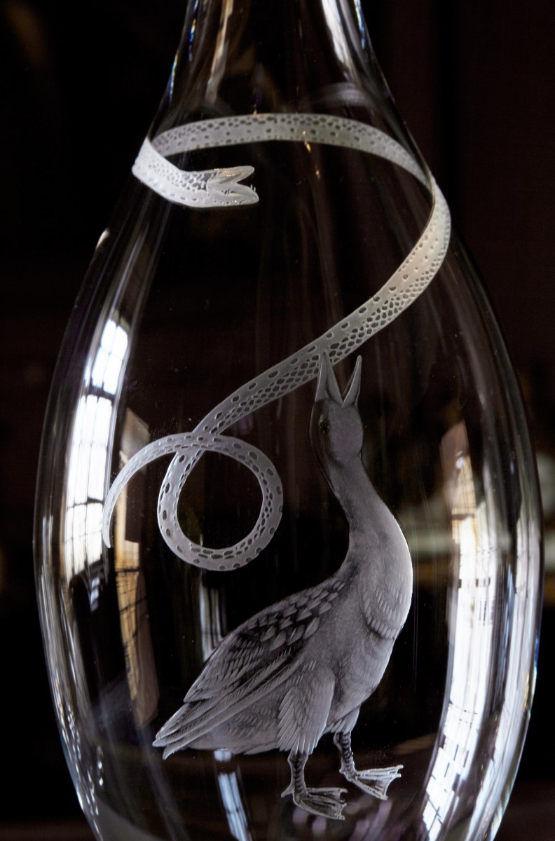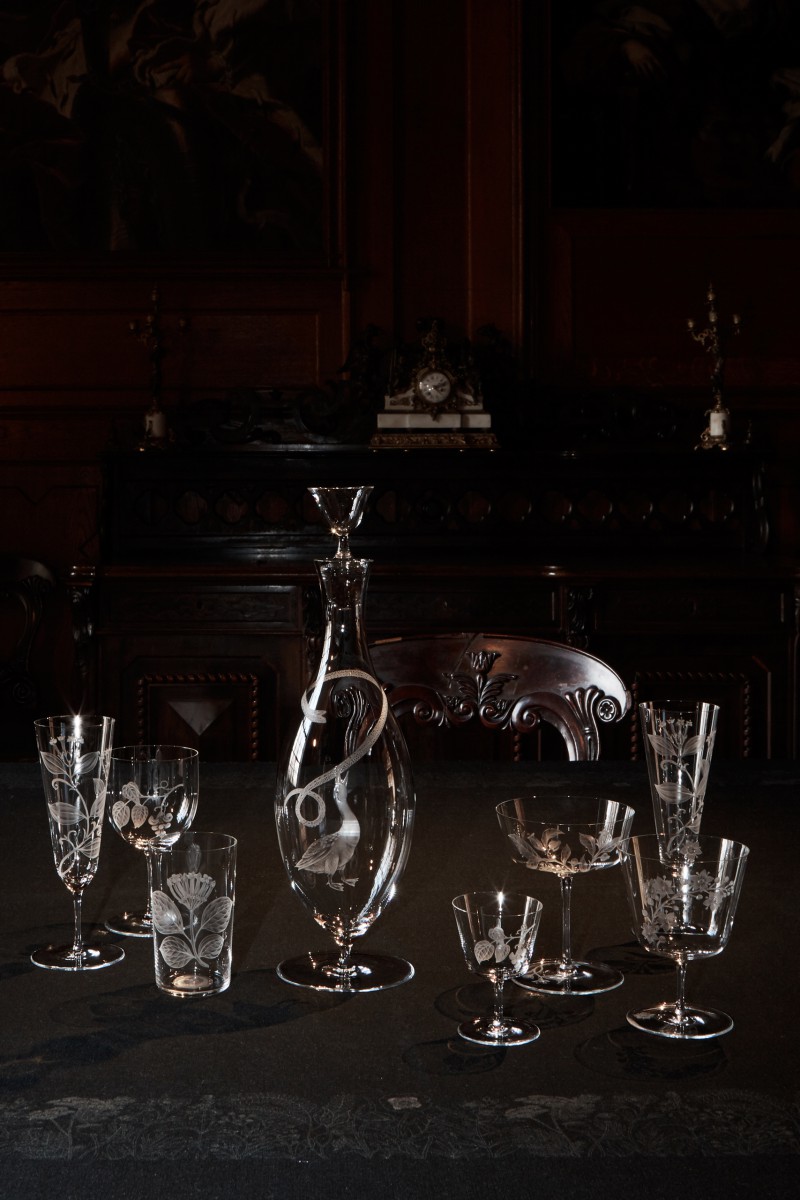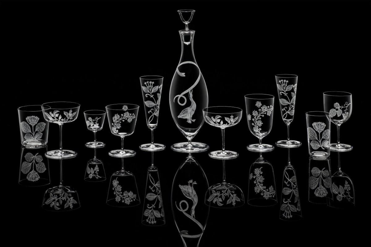 In a 12th Century castle, poisoning would have been a constant threat for the nobility, or more so for their cupbearers. Most used poisons were botanical, as were their antidotes, and often the antidotes for one poison were toxic in their own right. The idea of the antidote sits between science and myth, some having been chemically proven, while others truly magic and alchemical. Today we are consumed by another kind of food paranoia, associated with nutritional health, toxic chemicals and GMO. Ingredients that one source may consider superfoods, are claimed to be dangerous by another, and if we may no longer fear deadly nightshade, we never know what additives are among the food we consume. Of some toxins of course, we are well aware of, and we may choose to consume them intentionally. Alcohol is possibly our best loved poison, and has been an important part of our culture for millennia. Taking in consideration the order in which different spirits are habitually served during a meal (apéritif cocktail, wine, digestif spirit, etc), Katie Scott has created for Lobmeyr a set of drinking glasses each engraved with a different botanical poison. Each poison is also a known antidote to the previous poison in the drinking order. Project in cooperation with J&L Lobmeyr.