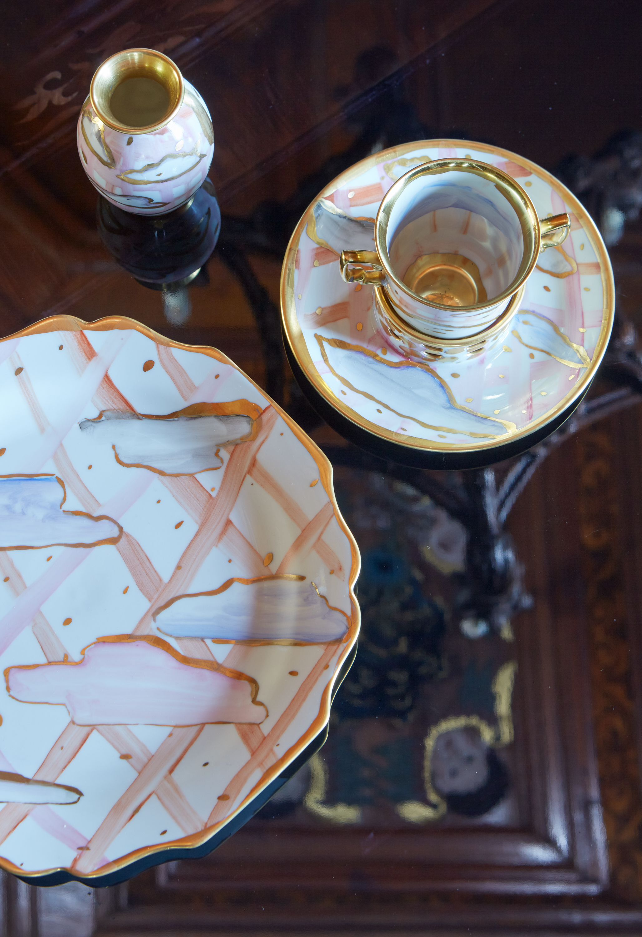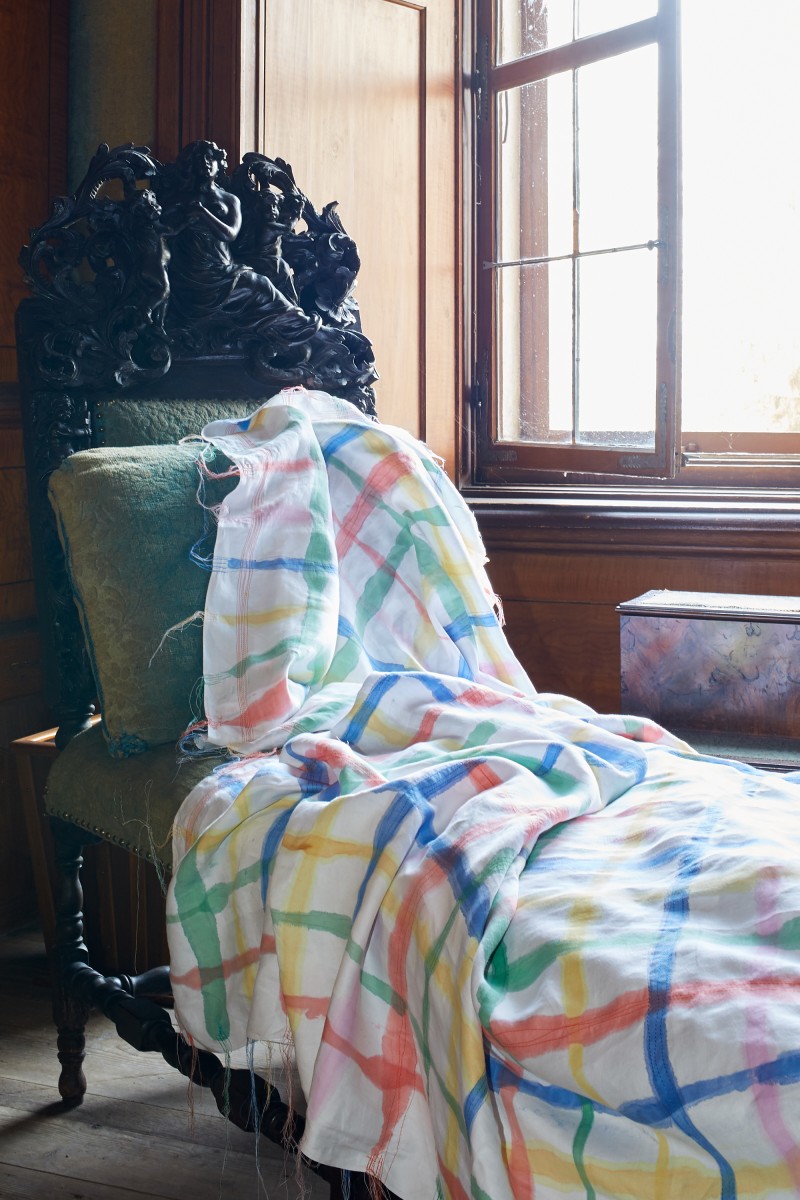 When she thinks of the perfect table setting, Katie Stout can’t help but think of the perfect hostess: the woman who is so busy entertaining, looking fabulous, sounding cultured, bantering intelligently, that she forgets to eat. Or maybe she just never really eats. Truly this is a great shame because eating should be everyone’s favourite table ritual, and objectively the most crucial. Imagining an antagonist to the perfect woman, Katie Stout imagined a naughty woman. Together with Augarten, she created (and painted) the perfect porcelain dinner set and table cloth for the woman who likes to be bad and loves to eat. The patterns and motifs on the dinner set are inspired by Katie Stout’s perception of her own table rituals: messy, awkward and tardy. Liberated from glossy finishes, expectations and traditions, the seemingly low brow dinner set reminds us that sometimes one must descend to transcend. The eighteen plates are painted with bright colours and expressive manner; the motifs are layered juxtaposing historical shapes such as ribbons, with more abstract and primitive ones that need to be observed once the food has been enjoyed. Katie Stout has also intervened on one of the formal damask tablecloth of the castle, embroidering it to subtly encourage mischief. Project in cooperation with Augarten Porzellan.