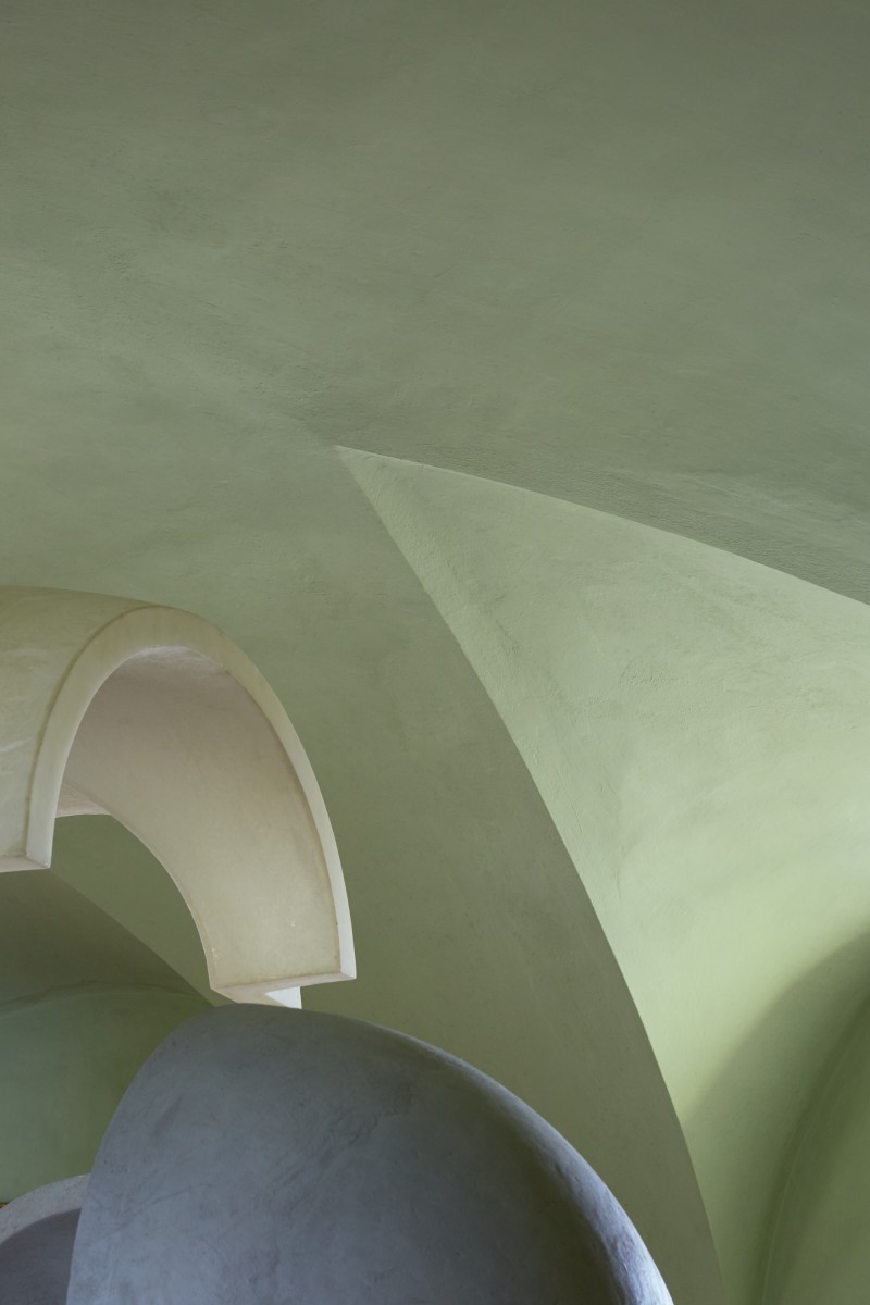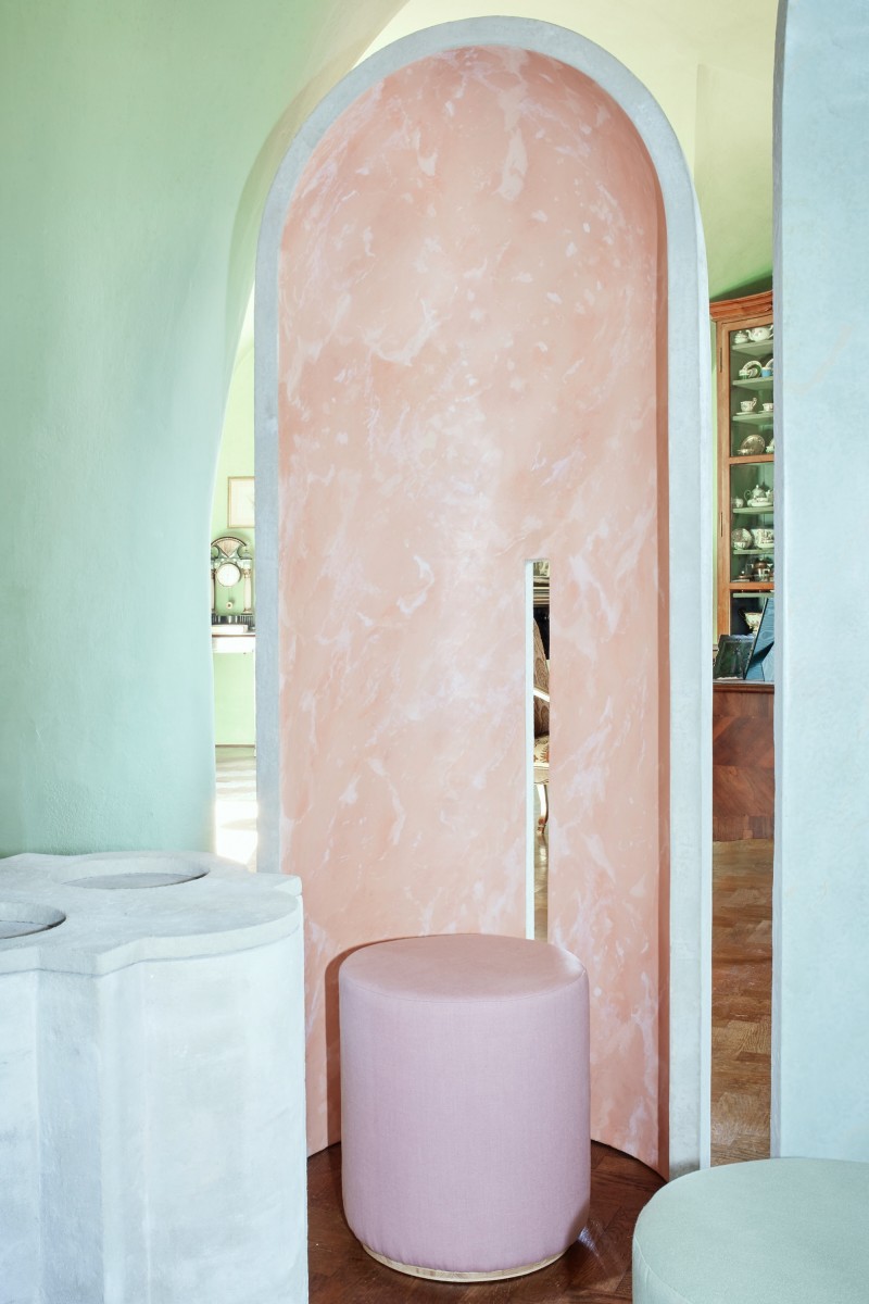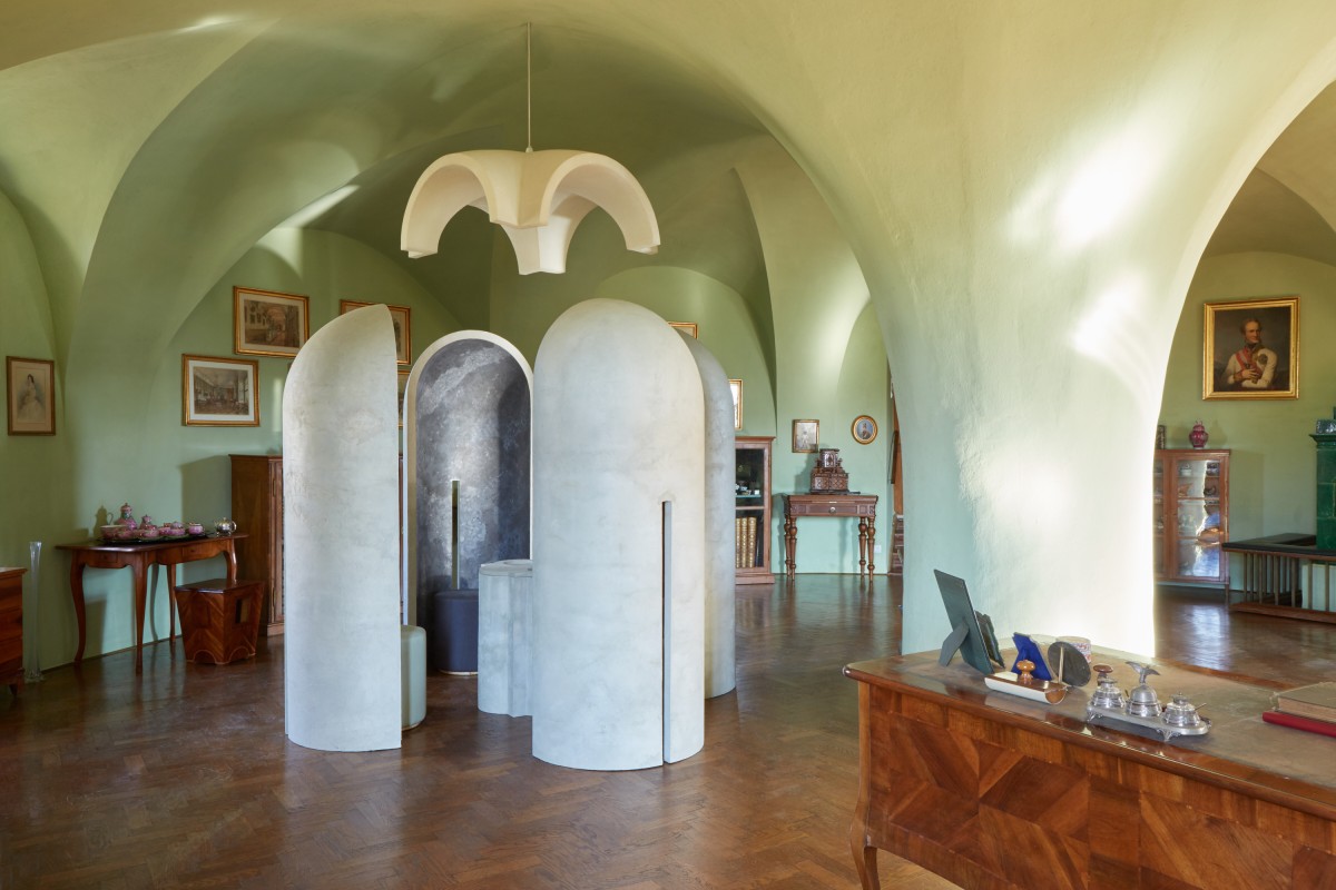 The Architecture of a Tea Ceremony is both a collective ritual—a performative sequence of gestures—and a physical design, guiding its users to interaction and contemplation, temporarily freed from the usual concerns of everyday life and allowing them to consciously embrace the emotional ambivalence of their emotions. A sculptural structure with a domed shape repeats the arched ceiling of the room and emphasises its capacity to seclude, playing with light and shadows. Four elements can be separated to reveal alcoves in which to sit. The different colours of the seating spaces recall the four seasons and the cycles of life, both a cosmological and a humanistic association, while the faux marble alludes to the recurring application of this technique in the castle’s interiors. Central to the four alcoves and sheltered by the domed structure, stands a static element: an altar for the ritual, a point of concentration and interconnection. With her design, Nel Verbeke questions the future perspectives of rituals and traditions, both in relation to her ongoing research on the emotional potential of design, and to the unique character of Schloss Hollenegg. The choice of this specific room in the castle—which will from now on will take the name of Tea Room—was made to complete a row of rooms in the castle, each with its own characteristic purpose and appearance.