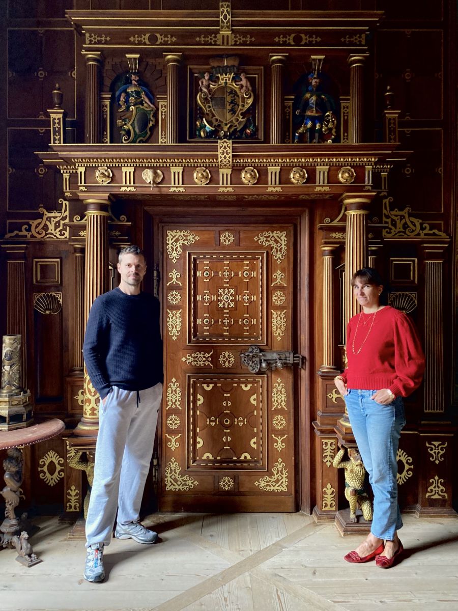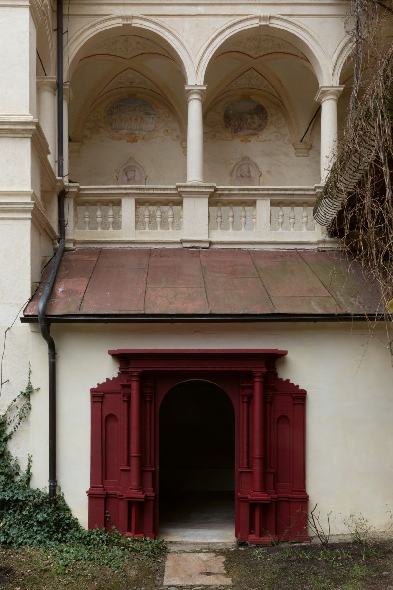 For Schloss Hollenegg Tuomas worked on the doorway as a symbolic passage between two worlds. He has recreated, in his own style, one of the sumptuous wooden doorways in the Tapestries rooms and “displaced” it to the courtyard of the castle. A doorway is a symbolic passage between two worlds. Passage is an ornamental door frame installed in the courtyard of Schloss Hollenegg. It is a copy of an existing door frame in the Tapestries Room, which Tuomas Markunpoika remade in his own style, with polystyrene and a polymer coating. In Schloss Hollenegg, many decorative ornaments depict events or styles from as far back as the 13th century but are, in fact, only a few hundred years old. They are copies to replace lost context and history or to animate the narrative of the castle. Markunpoika connects this practice to the development of Passage: the concept of copying can be understood in various ways. In China, there are two different ideas of a copy. Fangzhipin are imitations where the difference from the original is noticeable, such as miniature models on sale in a museum shop. The second concept for a copy is fuzhipin, these are exact reproductions of the original, which are considered of equal value to the original, with no negative connotations. In opposition to the West, where original elements are treated like relics, the East has developed a completely different technique of preservation that might be more effective than conservation or restoration: it takes place through continual reproduction.