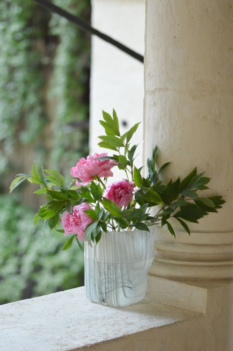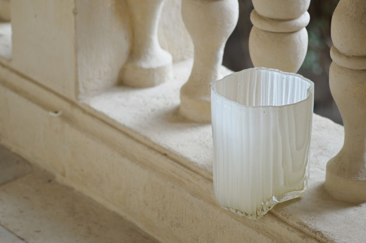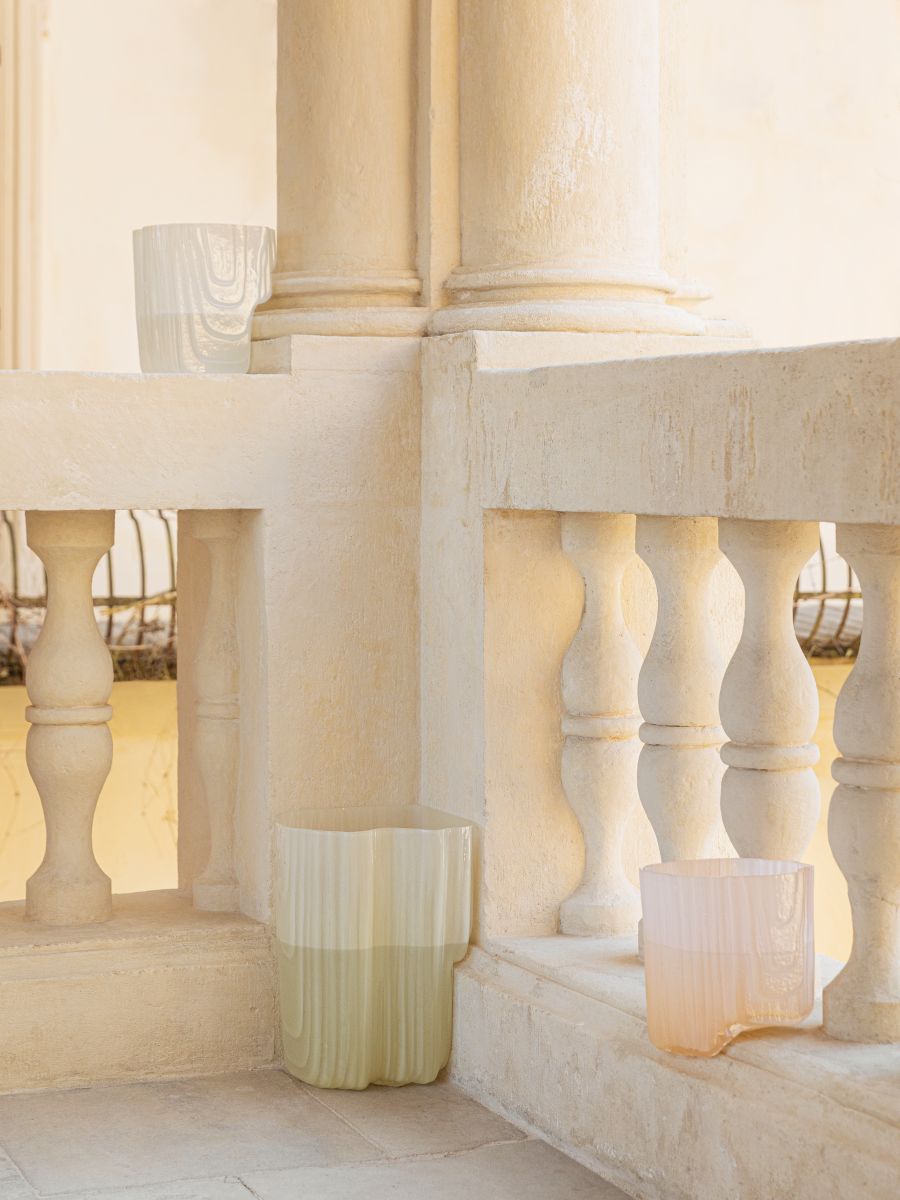 Antrei Hartikainen History sediments in layers, and nowhere is it more visible than in the architecture of places such as Schloss Hollenegg. Since the 12th century, the many owners of Hollenegg have built, repaired, and added to the castle and its structure. The different styles and the people's needs overlap to form a surprisingly coherent whole, and the architecture becomes a mould for the glass. While in residence in Hollenegg, Antrei 3D scanned details of the architecture in the loggias and staircases of the castle. The scans were then used to create glassblowing moulds made of many thin water-cut wood and metal sheets. In this way, the structure and details of the surface are repeated on the surface of the glass, so the layers of history merge together. The resulting vases are made to embrace and rest on columns, steps and balustrades. The colours of the glass mimic the subtle and layered tones of the walls. Once filled with water, the vessels act as lenses through which to discover intricate architectural details, mouldings and shapes that often go unnoticed.