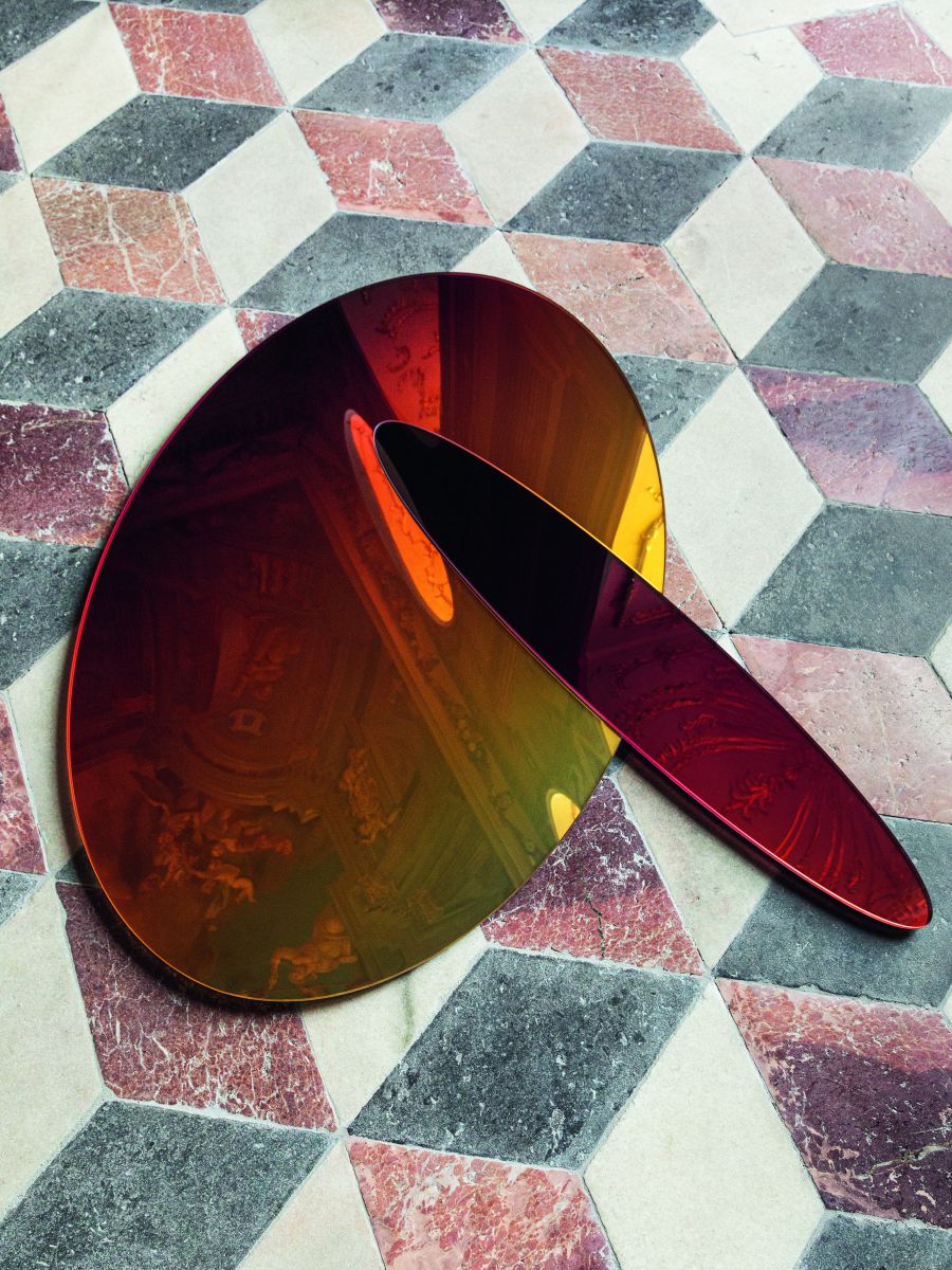 Germans Ermičs Off Course is a coloured mirror characterised by spherical shapes that float and intersect in space, reminiscent of planetary representations. The design of the mirror draws inspiration from the trompe l’oeil technique: the intersection of two elliptical elements creates an illusory effect of depth and perspective. Colour—added through innovative printing technology—enhances the effect. Off Course creates an unexpected perception of the room, making it a captivating exploration of the relationship between art, space, and perception. The mirror is an example of how industrial glass processes, such as CNC cutting, lamination and UV bonding, can be used in experimental ways to achieve creative designs that depart from the norm. The designer aims to push the boundaries of conventional glass processing methods.