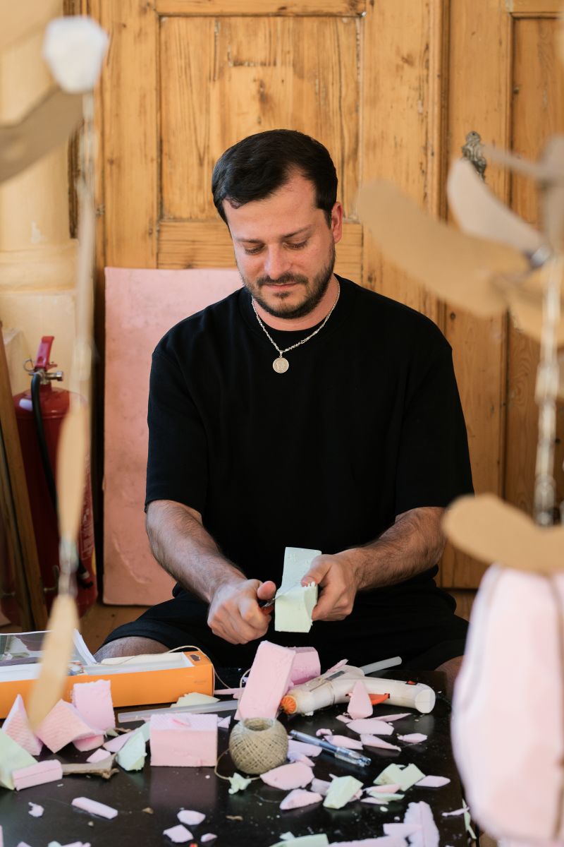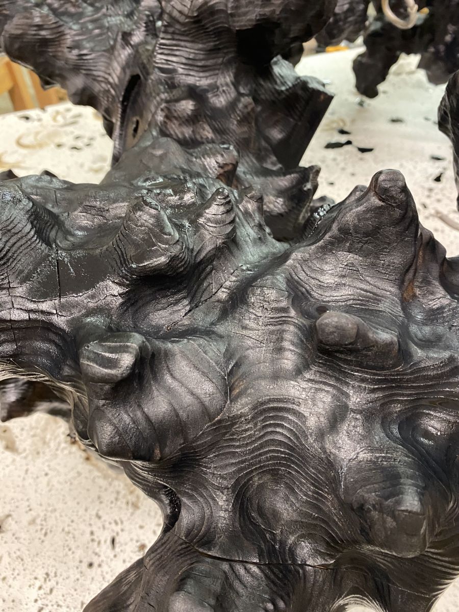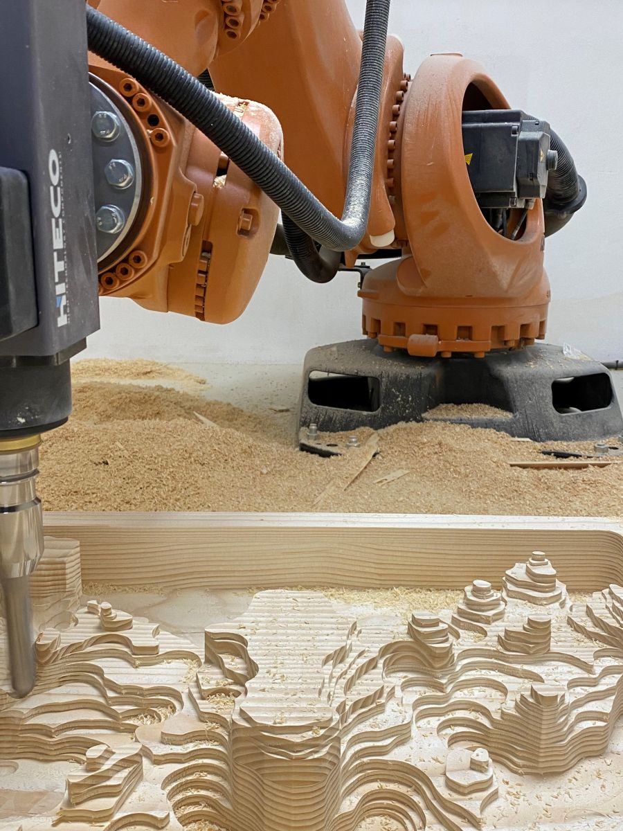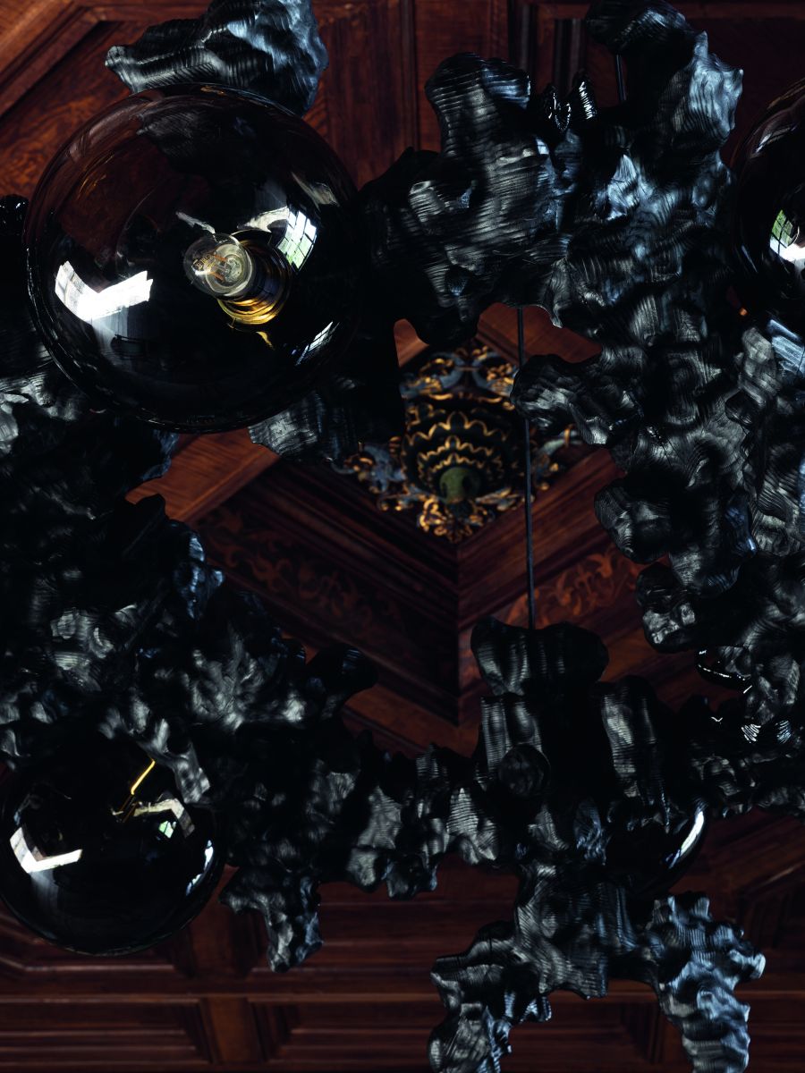 The glassmaking craft was historically built on closed, self-sufficient communities that drew on family ties and were directly dependent on the region and its resources. This idea of a community craft has now lost importance and closeness is no longer relevant in the manufacturing process of glass: raw materials are sourced to fit the production’s quality and price, and the products are rarely meant for a local market. The alienation of the glass craft brings Podracky to a fantastical scenario: what if glass artefacts were not made by the hands of artisans but “grow” from sand and ashes. Podracky’s project blends imagination, craft and technology. The sculptural chandelier combines glass with wood—an indispensable resource in the manufacturing of glass. The central body is made of charred wood, blackened by fire. The shapes that connect the glass elements were created with the help of robotic machine that processed the hand gestures of the designer. Handcraft and digital fabrication are used in combination and in equal measures. They simulate growth as a natural process and it is as if the glass was sprouting from the ashes of the black chandelier.