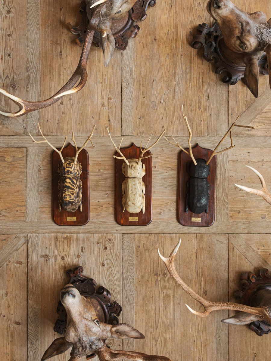 The Wolpertinger is a mythological creature, in the form of a hunting trophy, half bark beetle and half deer. Humorous yet thought-provoking, it portrays the danger—seriously exacerbated by climate change—posed to forests by the bark beetle. Craftsman Thomas Rauch has sculpted the three trophies from Norwegian spruce—a tree extremely susceptible to bark beetles. The antlers, made from oak branches, were sand blasted to enhance their natural texture. The ‘Wolpertinger’ have been charred with the japanese technique of Shou Sugi Ban. Each degree of charring corresponds to a specific year’s intensity of beetle infestation. Charring the wood protects the wood from rain and sun and also accentuates the beauty of the grain, creating a striking contrast between the darkened surface and the underlying wood.